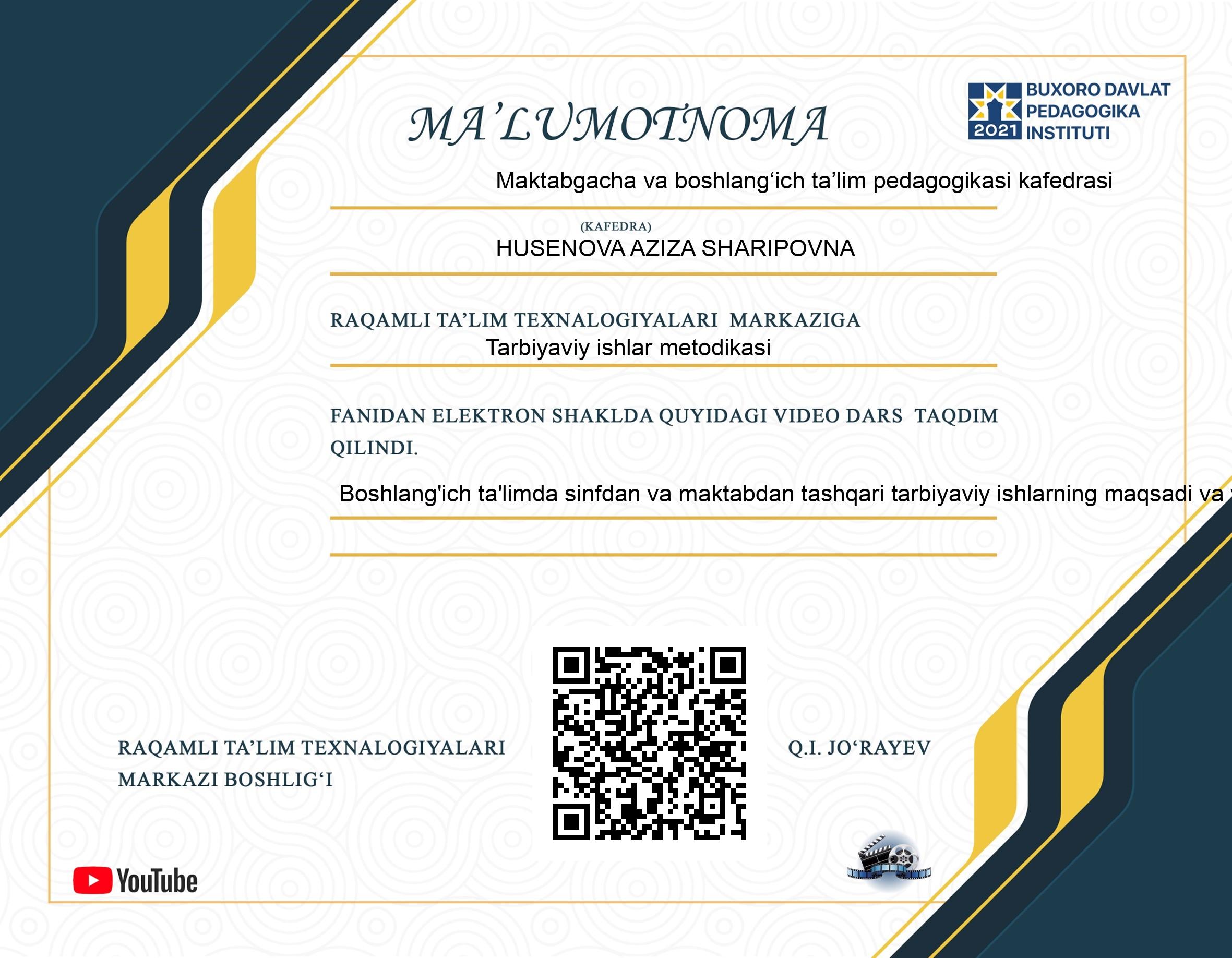 Tarbiyaviy ishlar metodikasi / Boshlang'ich ta'limda sinfdan va maktabdan tashqari tarbiyaviy ishlarning maqsadi va vazifalari