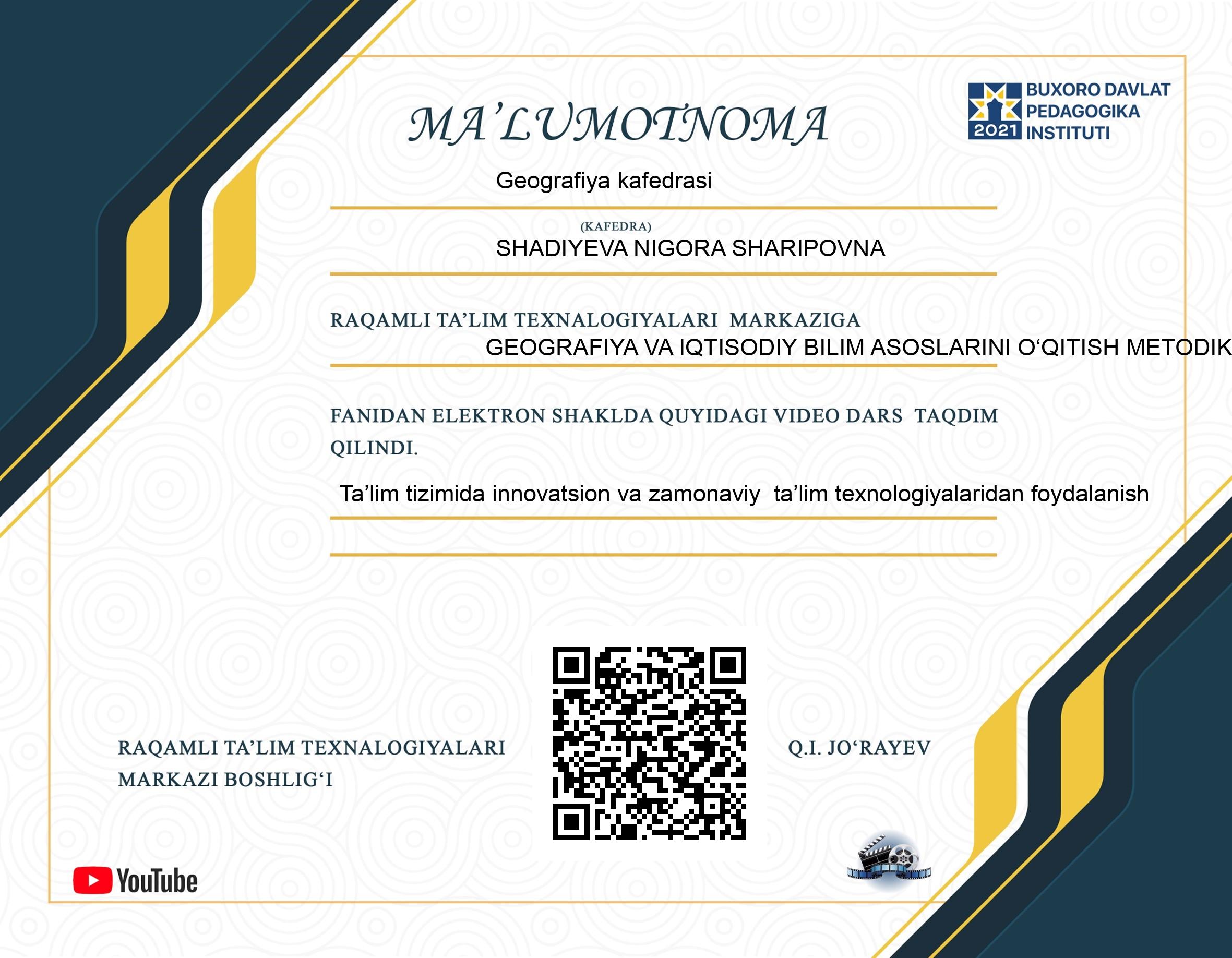 GEOGRAFIYA VA IQTISODIY BILIM ASOSLARINI O‘QITISH METODIKASI / Ta’lim tizimida innovatsion va zamonaviy ta’lim texnologiyalaridan foydalanish